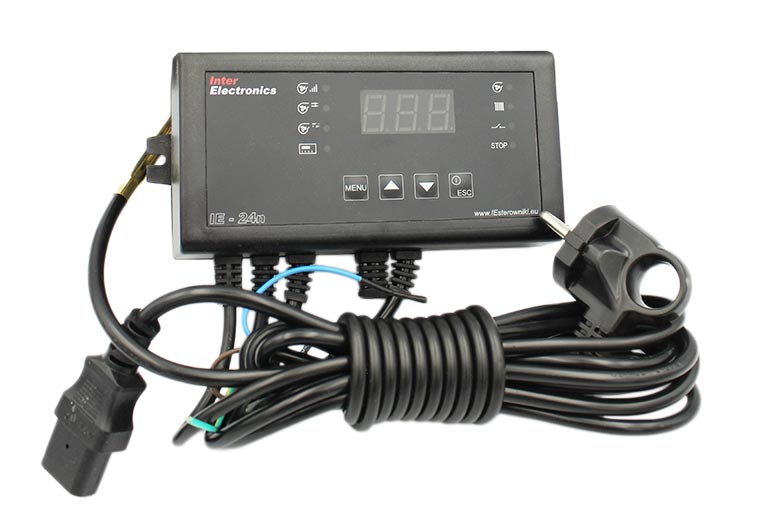 Контроллер IE 24n оснащён защитой от перегрева — при температуре около девяноста градусов устройство автоматически останавливает вентилятор и насос. Также предусмотрен режим антизамерзания: при понижении температуры теплоносителя автоматика включает насос для предотвращения замерзания воды в системе. Возможность подключения комнатного термостата делает эксплуатацию ещё удобнее — пользователь может регулировать не только температуру котла, но и температуру в помещении. При отключении питания контроллер сохраняет текущие настройки, а после восстановления напряжения автоматически возобновляет работу в прежнем режиме.